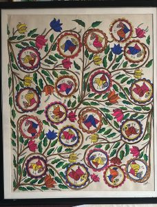 This vibrant artwork is painted on paper using multi-colored acrylic paints, presenting a decorative interpretation of nature. The composition features a beautifully spreading tree with flowing branches, leaves, flowers, and stylized birds enclosed within circular floral frames. These circular patterns create rhythm and visual harmony across the entire painting.
